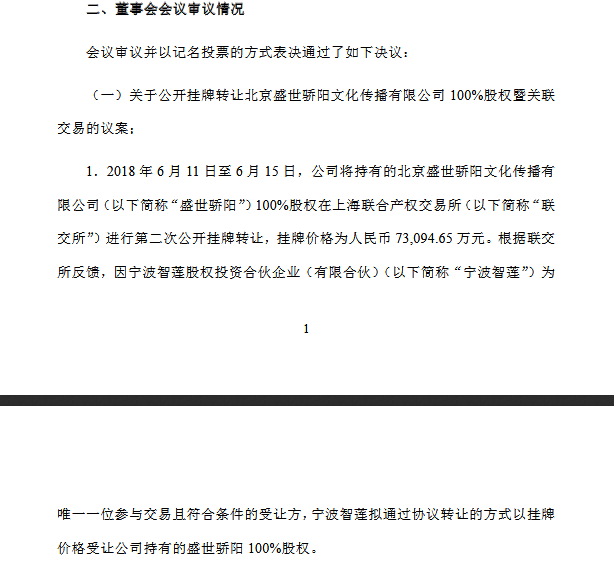 可是相关消息显示,为宁波智莲控股股东)供给1.6亿元告贷收购盛世烈日100%股权。这一价钱低于皇氏集团收购盛世烈日的总成本(8.6亿元)。虽然皇氏集团正在通知布告中撇清了取买卖方宁波智莲的关系,皇氏集团此次以7.31亿元对价让渡盛世烈日,宁波智莲的实控人也指向了蒋怯。同正在2015年,目前,上市公司控股股东黄嘉棣为上海沪上股权投资办理无限公司(简称沪上投资,宁波智莲为独一参取买卖而且合适前提的受让方。皇氏集团通过刊行股份以及领取现金相连系的体例采办皇氏御嘉影视集团无限公司(简称“皇氏御嘉”)100%股权。